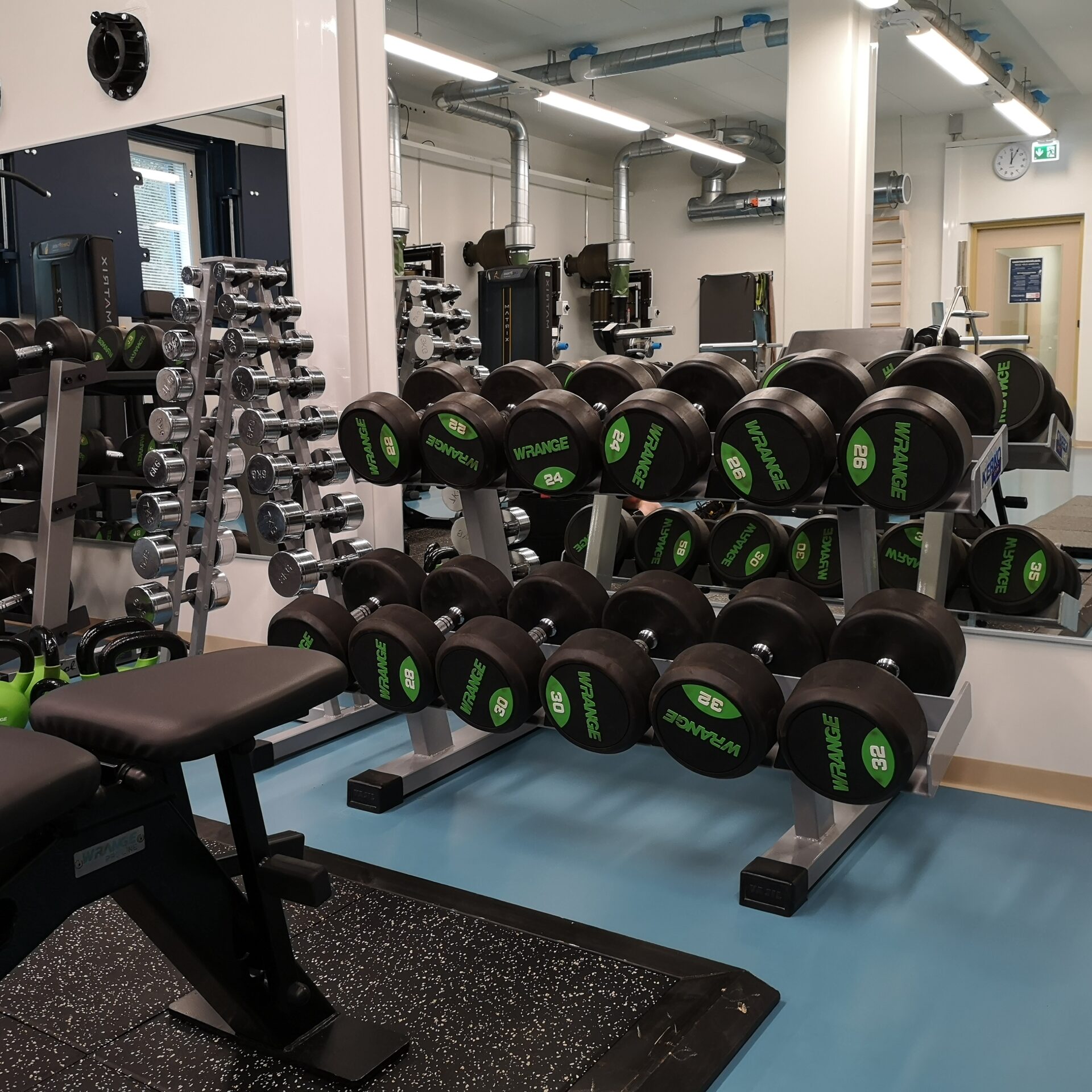 Pääskyn koulukeskuksen kuntosali on tasokas ja monipuolinen. Pukuhuoneissa on suihkut ja WC:t.